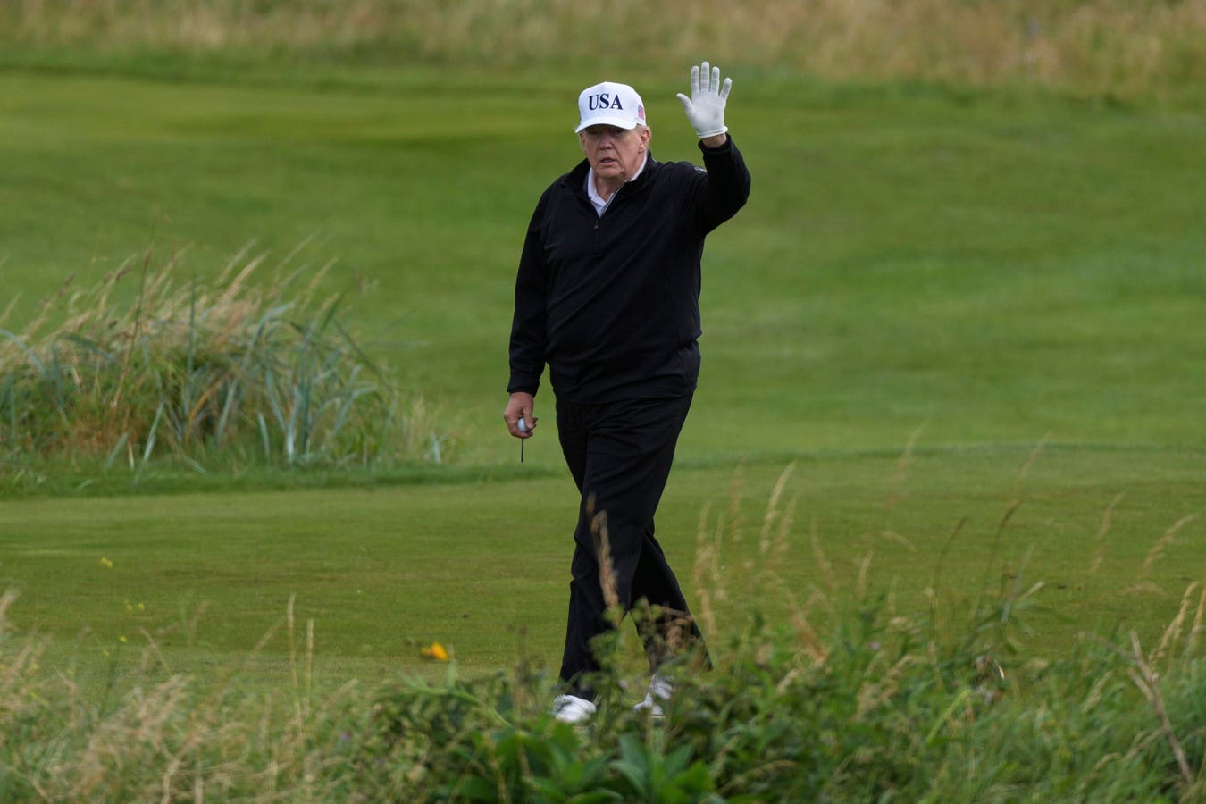 President Donald Trump waves to reporters as he plays golf at the Trump Turnberry golf course in … More