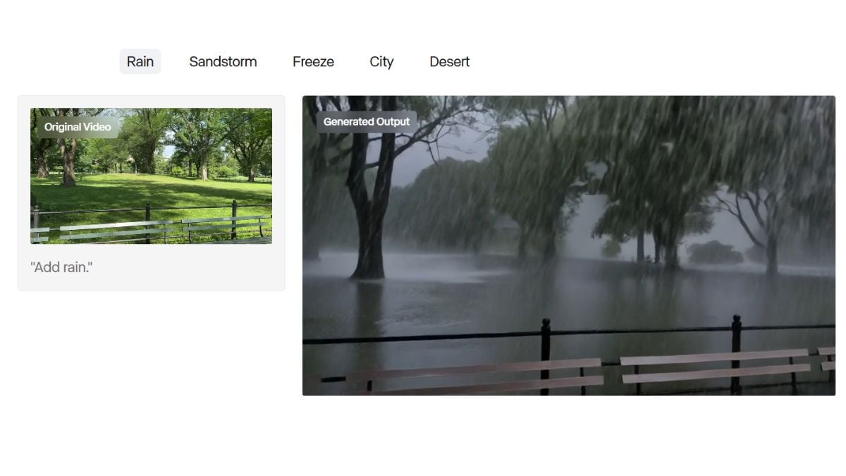 One of the most impressive abilities of the AI video model is to transform environments, locations, seasons, and the time of day. This means users can upload a video of a park on a sunny morning, and the AI model can add rain, sandstorm, snowfall effects, or even make it look like the night-time. These changes are made while keeping all the other elements of the video as they are.