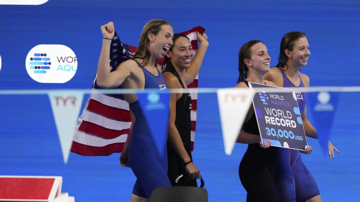 The American team of Regan Smith, Kate Douglass, Gretchen Walsh, and Torri Huske looked dominant from the off, and it wasn’t much of a surprise when Huske touched the wall to seal the win.