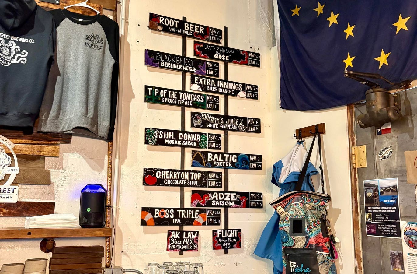 Valdez, AK (population 3715) has a “brewery district” aka two breweries across the street from each other. The older of the two is Valdez Brewing, who brews classic styles as well as modern beers like hazy IPAs and they even have a non-alcoholic hop water. Their tasting room is large and roomy with distinct Alaskan flair. I was pleasantly surprised to see a California common aka steam beer on draft as it’s a style barely brewed anymore.