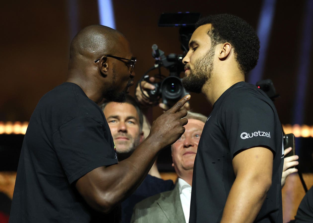 RIYADH, SAUDI ARABIA – AUGUST 14: Dillian Whyte and Moses Itauma face off ahead of their Heavyweight Fight during a press conference as part of the Dillian Whyte v Moses Itauma: ESports World Cup event at Kingdom Arena on August 14, 2025 in Riyadh, Saudi Arabia. (Photo by Richard Pelham/Getty Images)