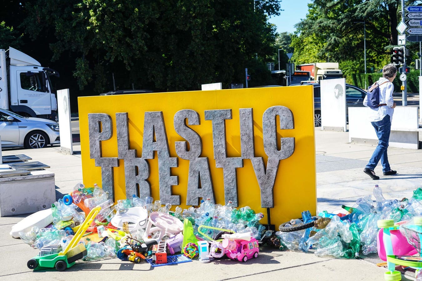 GENEVA, SWITZERLAND – 2025/08/04: A man walks behind a public art installation by Canadian artist, environmental activist, and photographer Benjamin Von Wong, titled ”The Thinker’s Burden” that aims to highlight the problem posed by plastic pollution ahead of the fifth resumed session of Intergovernmental Negotiating Committee 5.2 (INC5.2), set to begin on 5th August 2025. Protesters gather outside the Palais des Nations in Geneva, Switzerland, as negotiators convene for what is expected to be the final round of talks to craft a legally binding Global Plastics TreatyIntergovernmental Negotiating Committee 5.2 (INC5.2). This follows inconclusive negotiations held in Busan, South Korea, in 2024. (Photo by James Wakibia/SOPA Images/LightRocket via Getty Images)