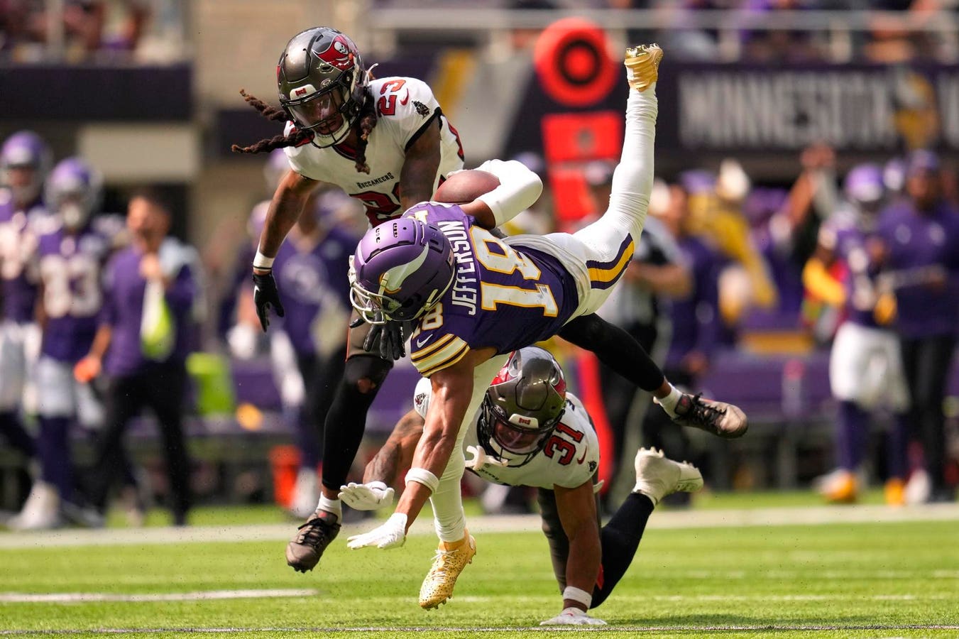 Minnesota Vikings wide receiver Justin Jefferson (18) is tackled by Tampa Bay Buccaneers safety Ryan Neal (23) and safety Antoine Winfield Jr. (31) after catching a pass during the first half of an NFL football game, Sunday, Sept. 10, 2023, in Minneapolis. (AP Photo/Abbie Parr)