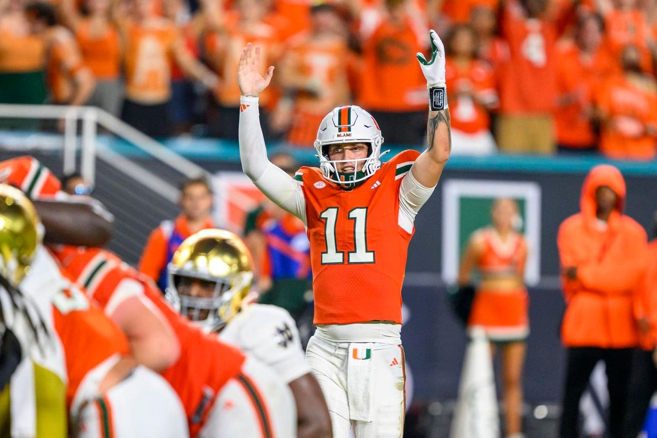 MIAMI GARDENS, FL – AUGUST 31: Miami Hurricanes quarterback Carson Beck (11) raises his arms to signal a touchdown scored by running back CharMar Brown (not shown) during the college football game against the Notre Dame Fighting Irish on August 31, 2025 at the Hard Rock Stadium in Miami Gardens, FL. (Photo by Doug Murray/Icon Sportswire via Getty Images)
