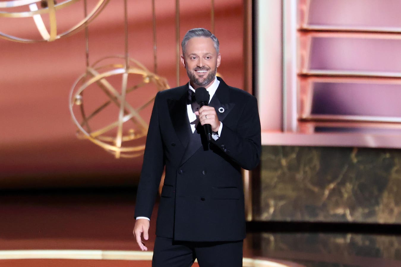 He started the monologue with some fairly self-deprecating jokes, saying this year’s Emmy “is not a big one like 75 or 80, but it’s the one they gave me” and “a lot of people are wondering why I am hosting.” The crowd met him with nervous laughter before he introduced a running bit that would continue through the award show.