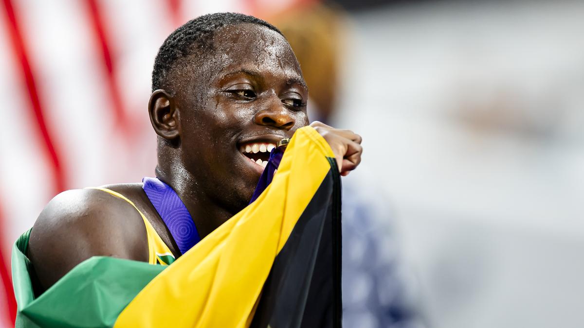 Kishane Thompson took silver in 9.82 seconds for a first Jamaican one-two in a global event since the 2012 Olympics, while defending champion Noah Lyles of the United States rounded out the podium in 9.89 seconds.