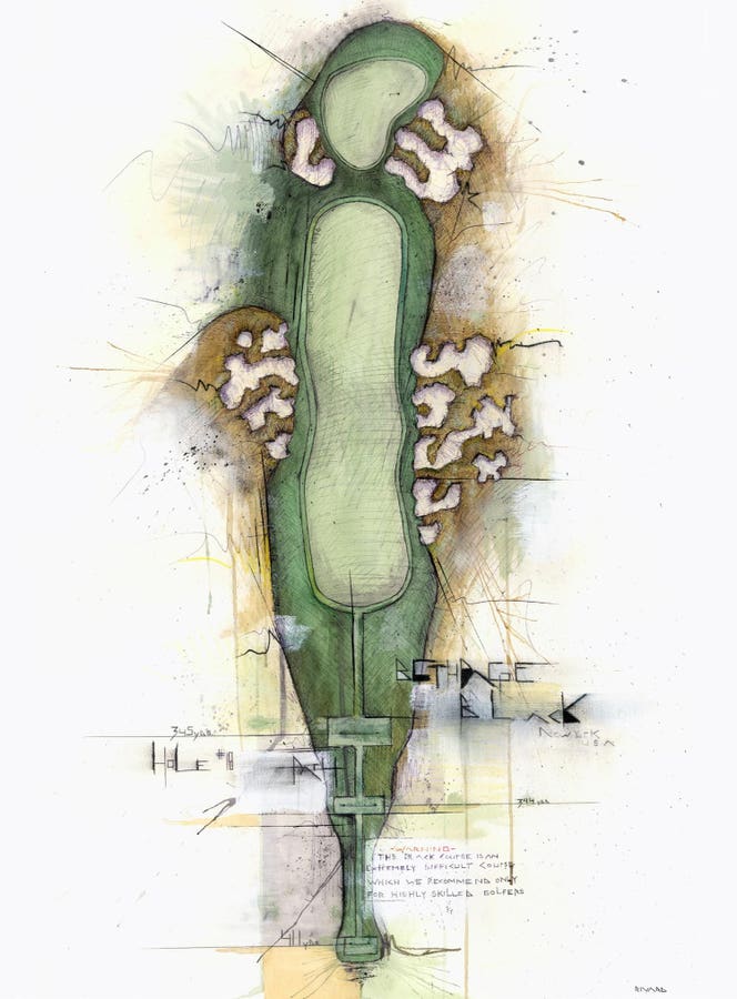 The rugged and brash illustrations of top-down hole designs come from Charcoal Golf’s artist and illustrator, Mark Rivard. His artwork bridges golf’s traditional, prim-and-proper image with a street- and urban-inspired aesthetic. Rivard’s renditions of famous golf holes are clearly recognizable, yet possess a gritty, almost unfinished quality, with geometric patterns intermingling with bold colors and blurred lines.