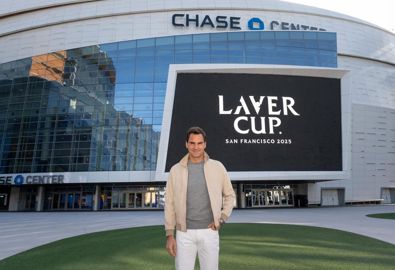 SAN FRANCISCO, CALIFORNIA – MARCH 8: Roger Federer stands outside Chase Center as part of the Laver Cup San Francisco Launch for 2025 on March 8, 2024 in San Francisco, California. (Photo by Loren Elliott/Getty Images for Laver Cup)