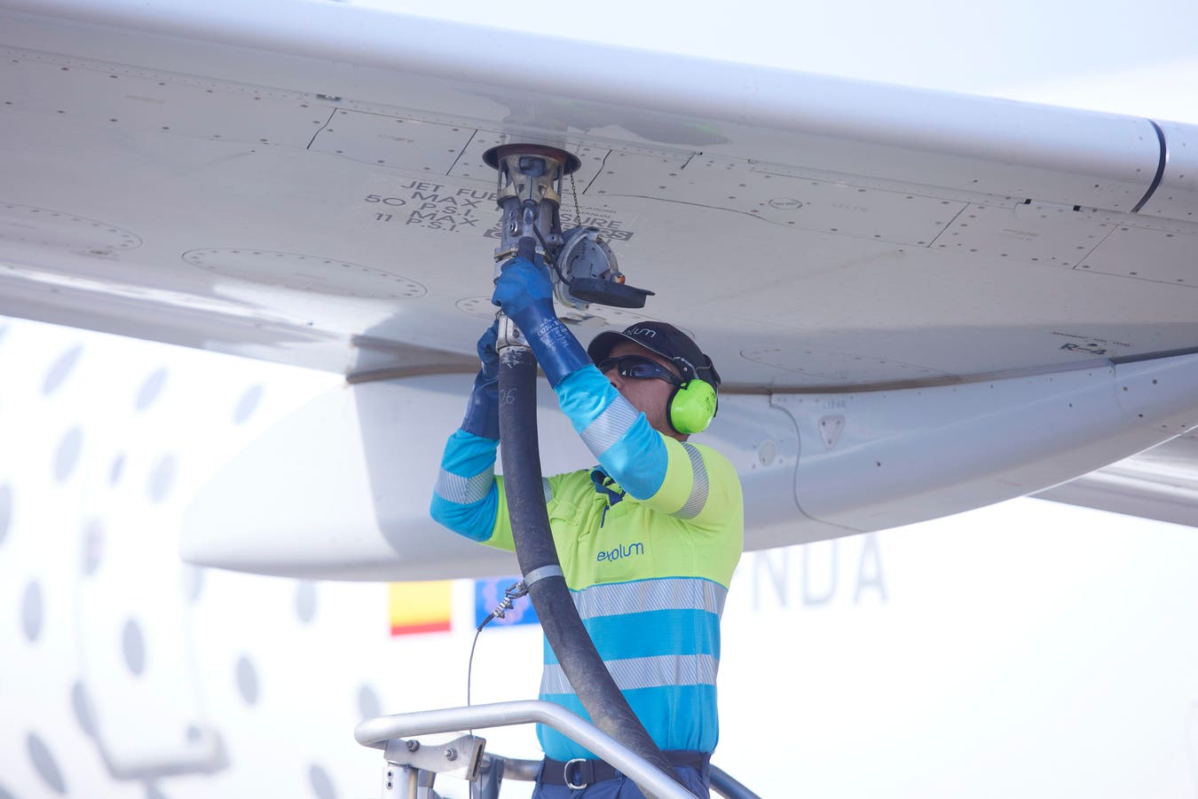 SEVILLE ANDALUSIA, SPAIN – NOVEMBER 25: An operator performs the maneuver to refuel an airplane during the presentation of the new second-generation sustainable fuel for aviation that Cepsa will start offering to its customers at San Pablo airport, on November 24, 2022 in Seville (Andalusia, Spain). The fuel manufacturer, Cepsa, has presented a second-generation fuel with the peculiarity that it complies with the zero carbon seal. (Photo By Joaquin Corchero/Europa Press via Getty Images)