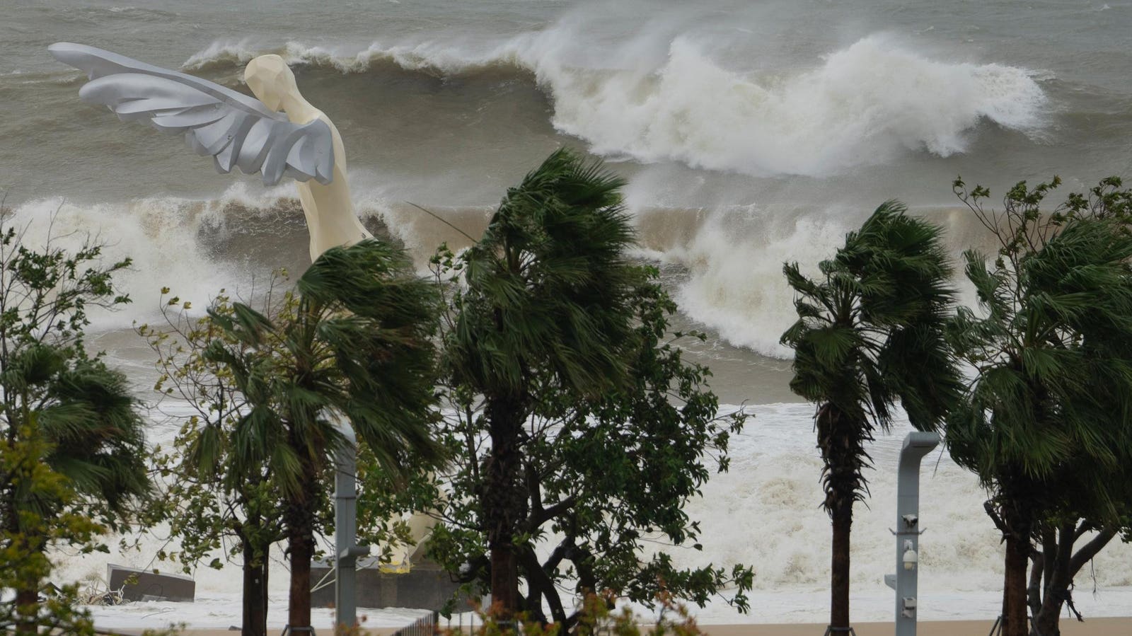 Waves crash onto a beach near a giant sculpture in Shenzhen in southern China’s Guangdong province on Wednesday.
