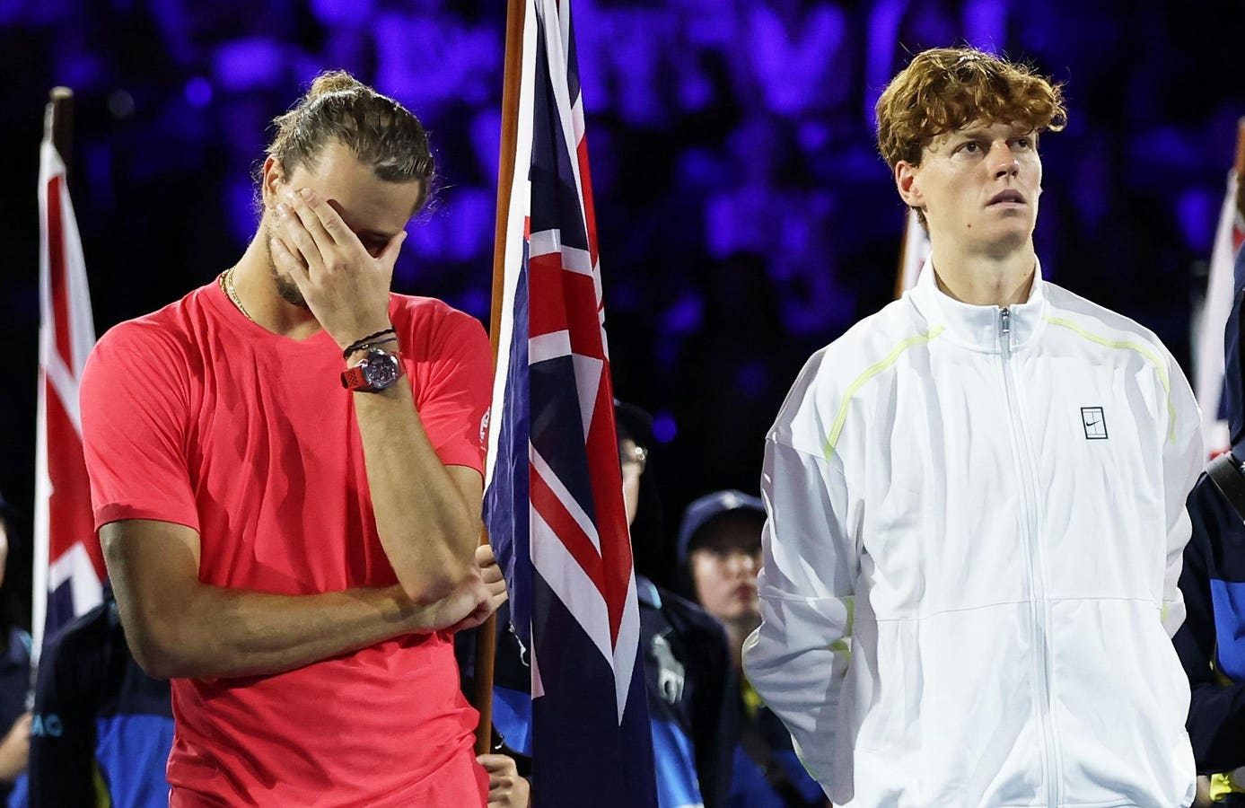 MELBOURNE, AUSTRALIA – JANUARY 26: Winner Jannik Sinner of Italy and runner-up Alexander Zverev of Germany shows his emotion as they wait for the Men’s Singles trophy presentation following the Men’s Singles final during day 15 of the 2025 Australian Open at Melbourne Park on January 26, 2025 in Melbourne, Australia. (Photo by Clive Brunskill/Getty Images)