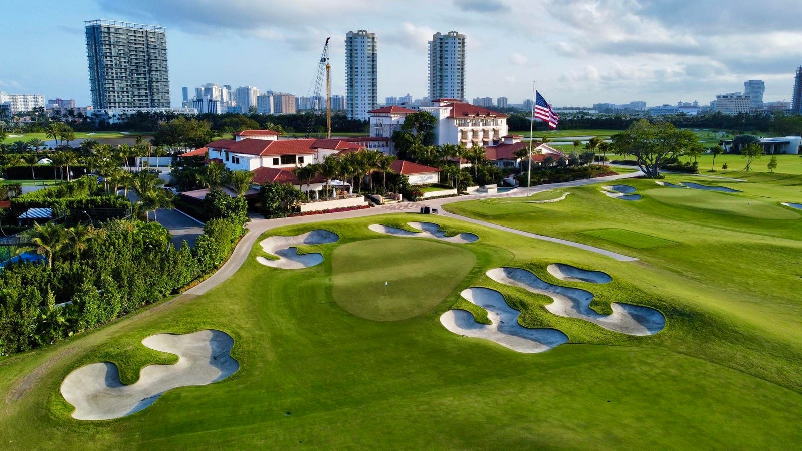 Aerial of the golf course and clubhouse at Shell Bay, a modern luxury private club in Hallandale Beach.