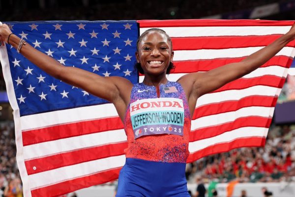 TOKYO, JAPAN – SEPTEMBER 14: Gold medallist, Melissa Jefferson-Wooden of Team United States, poses for a photo with the national flag after victory in the Women’s 100 Metres Final on day two of the World Athletics Championships Tokyo 2025 at National Stadium on September 14, 2025 in Tokyo, Japan. (Photo by Cameron Spencer/Getty Images) Getty…