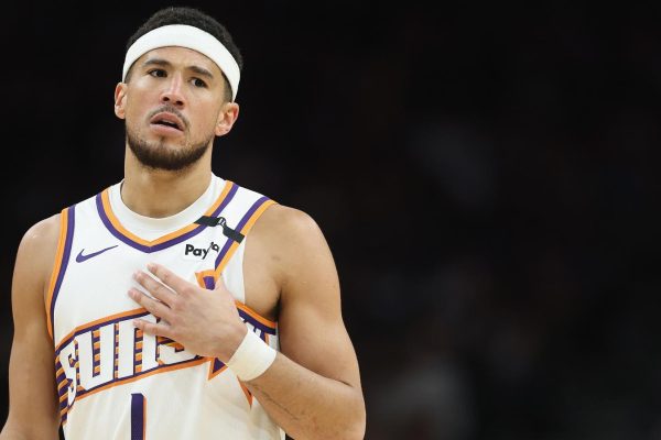 PHOENIX, ARIZONA – APRIL 11: Devin Booker #1 of the Phoenix Suns reacts during the second half of the NBA game against the San Antonio Spurs at PHX Arena on April 11, 2025 in Phoenix, Arizona. NOTE TO USER: User expressly acknowledges and agrees that, by downloading and or using this photograph, User is consenting…