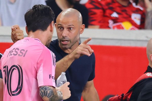 HARRISON, NJ – JULY 19: Javier Mascherano head coach of Inter Miami talks with Lionel Messi #10 of … More Inter Miami during a hydration break during the first half of the game against the New York Red Bulls on July 19, 2025 at Sports Illustrated Stadium in Harrison, New Jersey. Photo by Rich Graessle/Icon…